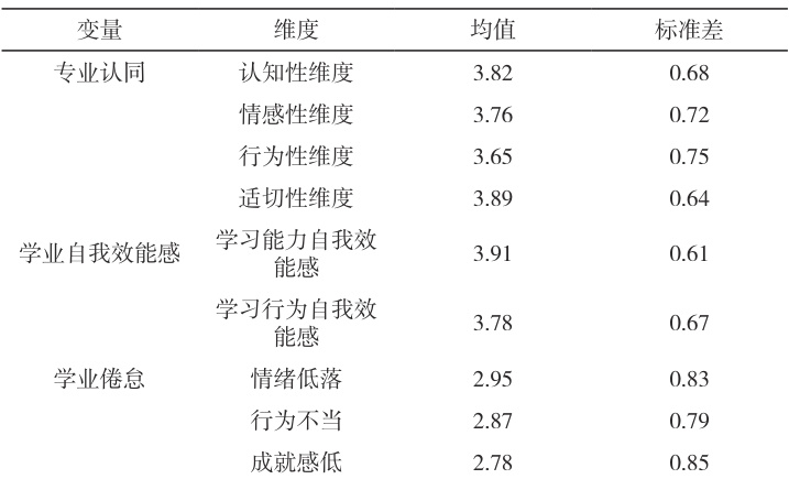 从表 1 可以看出,专业认同和学业自我效能感的均值较高(均高于 3.5),而学业倦怠的均值较低(均低于 3.0),表明大学生整体专业认同和学业自我效能感水平较高,学业倦怠水平较低。