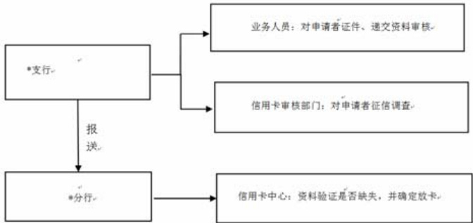 信用风险主要是商行对客户信用资料审核不严格或者审核中存在漏洞,导致信用水平较差、偿还能力较差、债务较多的客户顺利获得信用卡,最终导致信用卡不良资产的产生。根据整理, * 支行信用卡业务信用风险管理流程如图2-2 所示。
