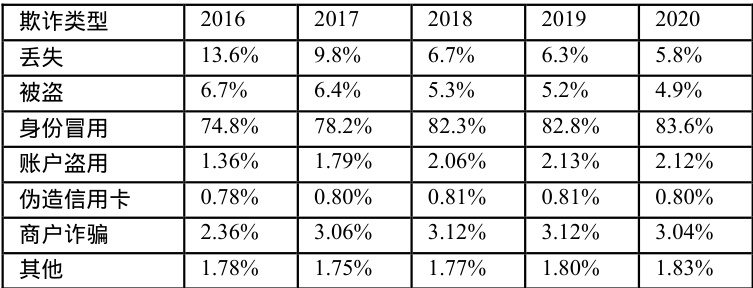 从表2-1 对*支行信用卡业务欺诈风险分布情况的整理中可以了解到,该行主要的欺诈风险主要有丢失、被盗、身份冒用、账户盗用、伪造信用卡、商户诈骗这几项,而其中主要以身份冒用为主,且分布占比呈现出逐年上升趋势,由2016 年的 74.8% 上升到 2020 年的 83.6% 提升幅度较大,这说明该行在身份验证这一方面的管理存在一定的问题,暴露出其现行的信用卡欺诈风险管理流程中仍存在一定的问题,导致欺诈风险仍未得到合理控制。