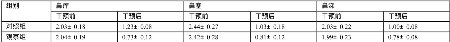 2 组患者干预后,鼻塞、鼻痒、鼻涕等症状评分均有明显改善,且观察组相较于对照组分值更低( P<0.05. )。