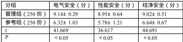 采用安全隐患管理的管理组电电气安全、性能安全、洁净安全评分均高于参考组, ρP<0.05 ,见下表2。