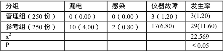 本次研究中,管理组在安全隐患管理下,电气安全评分为( 9.14±0.29 )分、性能安全评分为( 8.95±0.64 )分、洁净安全评分为 (9.02±0.51 分,均高于参考组,管理组仅有 3 份管理记录中存在仪器故障,不安全情况发生率为 1.2% ,低于参考组的 11.6% ,P 均 <0.05 ,具统计学意义。