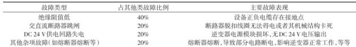 除了上述常见故障类型外,逆变器还可能出现一些其他类型的故障,约占总故障的 15%o 。这些故障包括绝缘阻值低、交直流断路器跳闸、DC24V 供电回路失电等。表 3 为其他类故障的详细数据统计。