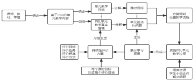 基于PBL教学模式下的单元教学具体流程首先要进行前端分析:教师要先研究课标、教材、学情,明确合适的基于PBL 的单元主题。然后,进行设计与开发:基于预期结果,确定合适的评价证据后,创设合适的单元教学真实情境,同时确定单元教学目标;通过将大单元教学目标分解为对应的课时目标,同时再将单元大情境拆分为单元驱动性的问题,设计对应的教学流程。教师需要提前提供好相关的教学资料以及设计好相关的持续性评价方案,包含评价的目标、评价的任务、评价的标准、评价的方式,以及设计好课堂评价量表、学生成果评价量表、学生作业设计评价量表等;接着,是实施过程,形成学生的学习成果,根据持续性评价方案。最后,再通过持续性评价方案以及课堂评价量表不断优化单元教学过程,通过反思与总结形成最佳教学设计方案。