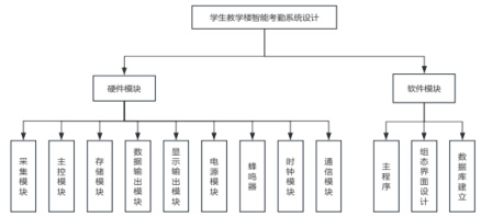 该考勤系统整体结构如图 4-1 所示,包括硬件模块和软件模块两大部分,进一步细分包括以下部分: