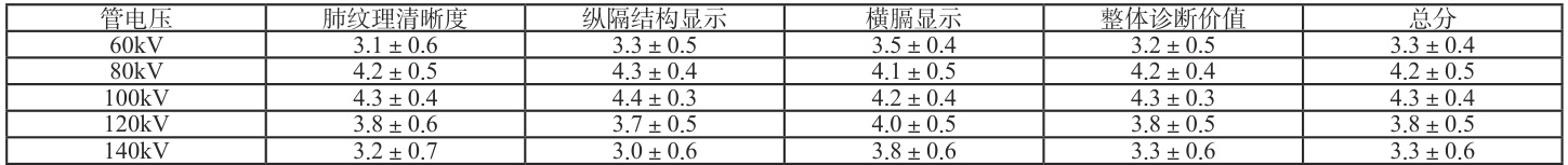 100kV 组在肺纹理清晰度、纵隔结构显示方面评分最优(均 >4 分),60kV 组因噪声大评分较低,140kV 组因对比度不足导致肺纹理模糊(表3)。
