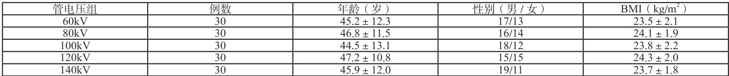 选取 2023 年 1 月至 2024 年 3 月在我院行胸部 DR 检查的患者 150 例,纳入标准:①年龄18~70 岁;②无严重胸廓畸形、大量胸腔积液或气胸(避免干扰组织对比度测量);③检查前未接受胸部手术或放疗。排除标准:①图像存在明显运动伪影;②体重指数(BMI)>30kg/m²(肥胖可能显著影响X 线穿透性)。采用随机数字表法分为5 组(每组30 例),各组年龄、性别、BMI 比较差异无统计学意义(