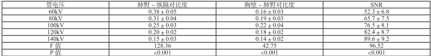 肺野- 纵隔对比度:随管电压升高显著降低( P<0.05 ),60kV 时最高( 0.38±0.05 ),140kV 时最低( 0.15±0.03 )(表2)。胸壁- 肺野对比度:随管电压升高呈先升后降趋势,100kV 时达最高 ( 0.22±0.04 ),与其他组差异有统计学意义(