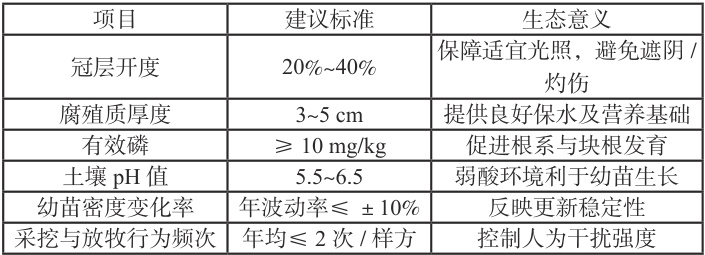 在群落—微生境双尺度上实施自适应管理,可通过调控冠层开度、疏除强竞争灌草、保持适宜凋落物厚度,营造光、水、养协同环境;在幼苗热点区设小尺度围栏,减轻踏压与啃食;针对低磷酸性土,点位增施有机改良剂与缓释磷,提高根系竞争力。管理层面构建长期监测与预警体系,将冠层开度、幼苗密度、成苗率、土壤有效磷与踏压强度设为核心指标,按年度与季节双尺度动态评估并调整措施。