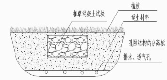 如图1 所示,为种植盆布置图。种植盆下部设置带孔隙的分离板,侧下方钻孔以实现透水透气。把预制好的适应性材料混凝土试块放进容器里,容器内剩余的空间要均匀填满同样的材料,并且要充分地压紧,让它的表面和试块保持在同一水平线上,在最上面再覆盖一层大约 0.5~1cm 厚的自然土壤。