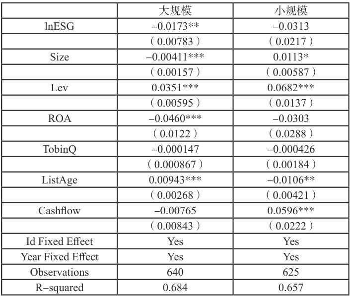 为进一步探讨企业规模在 ESG 表现影响债务融资成本中的异质性,本文对样本企业的资产规模中位数进行划分,大于中位数的样本为大规模企业,而小于等于中位数的样本为小规模企业,对两个子样本并分别进行回归分析,结果如表 7 所示。大规模企业的 lnESG 回归系数为 -0.0173,且在 5% 的显著性水平下显著,而小规模企业 lnESG 的系数为-0.0313 但并未达到统计显著性,表明ESG 表现的提高能够降低大型企业的债务融资成本。一般来说,规模较大企业有更高的市场曝光度,优秀的 ESG 表现更容易受到投资者和机构的关注,凭借更好的资源去开展 ESG 活动,改善企业形象、降低融资风险,进而显著降低债务融资成本,而小型企业可能面临更高的融资约束,其融资成本可能更多受到企业信用等传统财务指标的影响,而非ESG 表现。