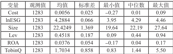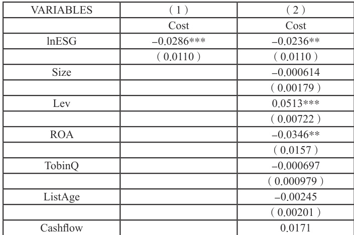 其中, Costit 为被解释变量, lnESGit 为解释变量,Controls 为控制变量组,表示上文所述的控制变量, μi 表示个体固定效应, λr 表示时间固定效应, εit 为随机扰动项。重点关注模型中的 lnESGit ,该变量系数能够衡量企业ESG 表现对债务融资成本的影响,若其显著小于0,则表明企业ESG 表现的提升能够降低企业的债务融资成本。