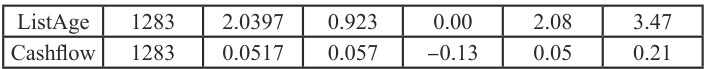 为进一步增强模型构建的合理性,基于对已有文献的研究,选取以下控制变量:企业规模以企业年末总资产的自然对数衡量,记为Size;资产负债率通过年末总负债与年末总资产的比值计算得出,记为Lev;企业总资产收益率采用年末净利润与年末总资产的比值进行衡量,记为 ROA;企业成长性用企业总市值与年末总资产的比值度量,记为TobinQ;企业上市年限采用企业上市年限加1 后取自然对数处理,记为ListAge;现金流比率用经营活动产生的现金流量净额与年末总资产的比值表示,记作 Cashflow。