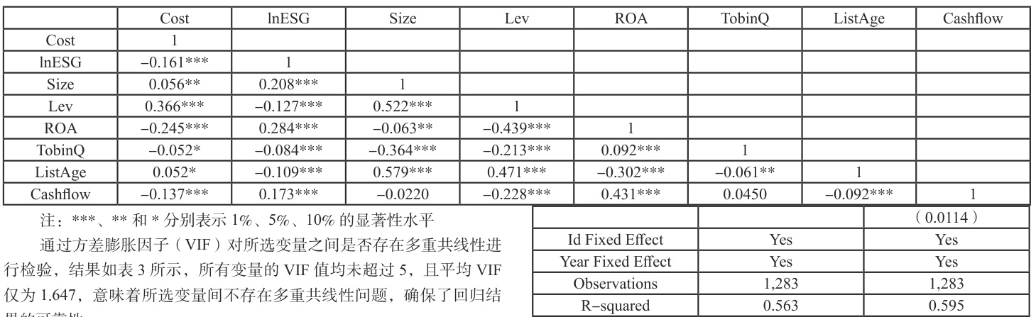 本文对变量进行皮尔逊相关性分析的结果如表 2 所示,根据结果可以看出,核心解释变量ESG 表现(lnESG)与被解释变量债务融资成本(Cost)在 1% 的统计显著性水平下呈现出明显的负相关趋势,二者相关系数达到 -0.161,这一结果提示企业 ESG 实践水平越高,其债务融资成本相应越低,为假设H1 提供了初步验证。