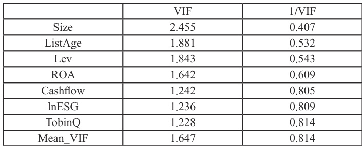 对其他控制变量而言,债务融资成本与资产负债率(Lev)呈显著正相关关系,与总资产收益率(ROA)和现金流比率(Cashflow)呈显著负相关关系,表明财务风险和盈利能力对债务融资成本有显著影响。尽管通过相关性分析观察到 ESG 表现与债务融资成本之间的负相关关系,但并不意味着企业的ESG 表现会直接导致其债务融资成本的降低,需要进一步进行多重共线性检验,以避免变量之间存在共线性。