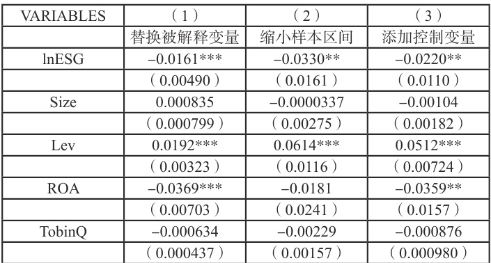 为排除疫情期间外部冲击对债务融资成本与 ESG 表现的干扰,本文将样本区间由 2013-2023 年缩小至 2013-2019 年,回归结果如表 5 列(2)所示,在缩小样本后进行回归,在 5% 的显著性水平下 ESG 表现(lnESG)的回归系数为 -0.033,表明即使不在疫情期间,ESG 表现仍显著降低企业债务融资成本,验证了实证结论的稳健性。