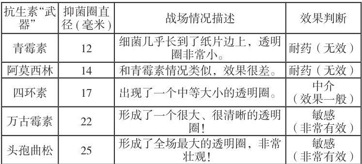 我们用尺子仔细测量了这些透明圈(抑菌圈)的直径,得到了(预期的)如下结果: