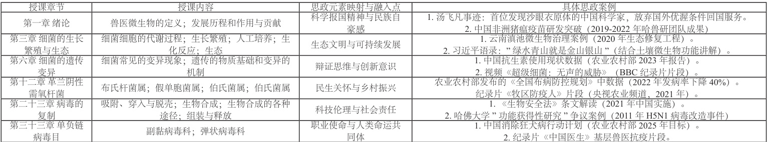表1 “ 兽医微生物” 课程章节映射的思政元素