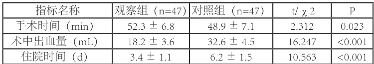 研究共纳入 2024 年 7 月至 2025 年 6 月期间在我院普通外科住院治疗的腹股沟疝患者 94 例,均为初次发病且经腹部 B 超或 CT 明确诊断。采用随机数字表法将患者等分为观察组与对照组,各47 例。两组患者在性别、年龄、体重指数、合并基础疾病、疝类型及病程时间等基线特征方面比较,差异均无统计学意义( ⋅P>0.05⟩ ),具有良好的可比性。