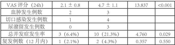 手术时间(min)、术中出血量(mL)、住院时间(d)、术后疼痛评分(VAS,术后 24h)、并发症发生率(如血肿、感染、尿潴留)以及复发率(术后 12月随访)。