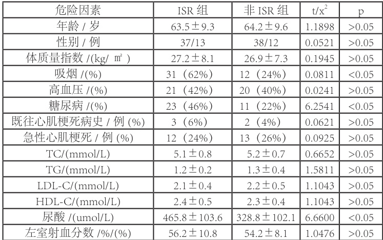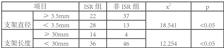 通过分析结果表示,两组患者性别、年龄、左室射血分数、急性心肌梗死、高血压病史、陈旧性心肌梗死、TC、HDL-C、TG、LDL-C 等无差异( (p>0.05) ),ISR 组患者的糖尿病、支架直径 <3.5mm 、吸烟史、支架长度 >30mm 、尿酸水平的比例比非 ISR 组高( (p<0.05) ),详见表 1 和表 2。通过分析表示,糖尿病、吸烟、支架直径与长度、个数和发生ISR 具有密切关系。