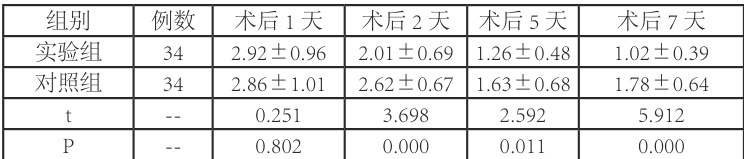 疼痛评分,术后1 天,没有显著差异,术后2、5、7 天,实验组评分低于对照组, P<0.05 。