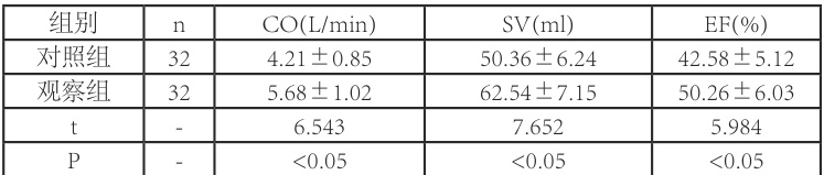 心功能指标:治疗前后分别采用超声心动图检测两组患者的CO、SV、EF。