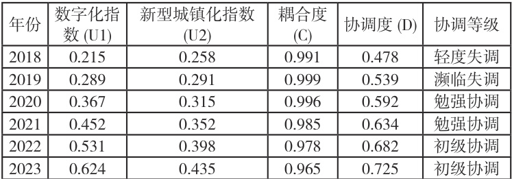 数据主要来源于 2019-2024 年《市统计年鉴》、《市国民经济和社会发展统计公报》根据熵值法计算得到2018-2023 年市数字化发展综合指数((U1) 和新型城镇化综合指数(U2),结果如表2 所示.