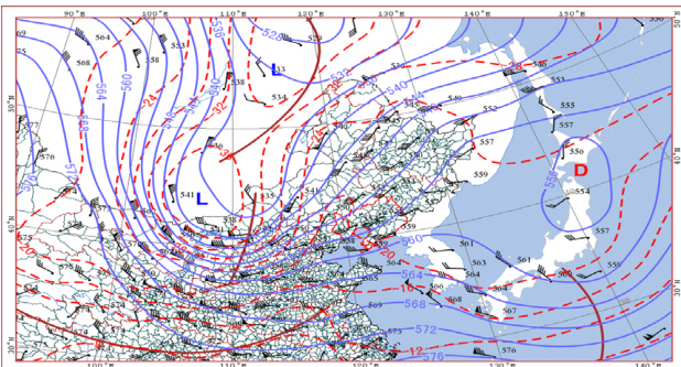在 500hPa 高度上,形势场呈现出两脊一槽的经向型环流。高压脊分别位于乌拉尔山以东地区和东北地区上空,贝加尔湖为广阔的槽区,冷空气在贝加尔湖以西堆积,温度槽落后于高度槽。涡前暖空气北抬,北部冷空气南压,两个系统之间等温线密集,对应地面形成一个锋区,走向为东北 - 西南。这种环流形势有利于冷空气的南下和暖湿空气的北上,为暴雪的形成提供了有利的大尺度环流背景。 700hPa 上,11 日 8:00 贝加尔湖到我国东北地区为切断低压控制,低压中心强度为 540dagpm ,位于贝加尔湖和内蒙古之间的位置,弱的高压脊控制日本海以东与西西伯利亚平原,辽宁省处于暖区之中。低涡在东移的过程中不断加强,有西西伯利亚脊前的西北气流下滑冷空气补充。到11 日8:00,经向环流加强,低压中心移至河北省接近辽宁省的位置,中心强度加强到 532dagpm 低涡的发展和移动为暴雪区输送了动力和水汽条件。