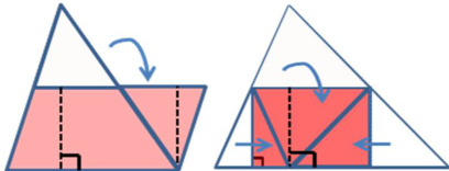 【设计意图:给每个小组提供了多个三角形学具,为避免学生盲从下手,在合作探究之前给学生一个整理和熟悉学习材料的过程,并先独立思考,帮助学生形成良好的研究习惯;在小组合作中,通过剪一剪、拼一拼、折一折等寻找到转化的方法,在观察、思考中找到三角形与平行四边形的关系,从而推导出三角形的面积计算公式。】