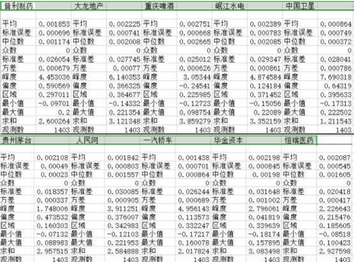 (1)用excel 求出十个股票的日平均收益率、最大值、最小值、方差等如图1。