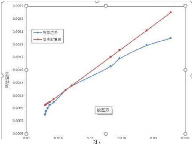 (3)当在资产组合中加入无风险资产时,向可行区域做切线来求得最优组合,即在以无风险利率为截距的切线上的点。利用规划求解与 TRANSPOSE 函数求出该投资组合中十个股票的占比,利用 SUMPRODUCT 和SQRT 求出资本市场线。资本市场线与动态前沿的切点即为最优解。如图3。
