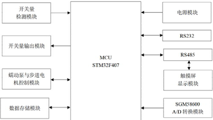 系统硬件可以分为核心控制模块和外围主要功能模块两个部分。控制模块以STM32F407 主控芯片为核心,外围电路主要有高精度 AD 转换电路、RS485 与 RS232 通信电路、开关量信号检测电路、蠕动泵与步进电机驱动电路、数据存储电路、开关量输出电路以及电源电路等。水质自动采样器控制系统的硬件结构图如图2 所示。