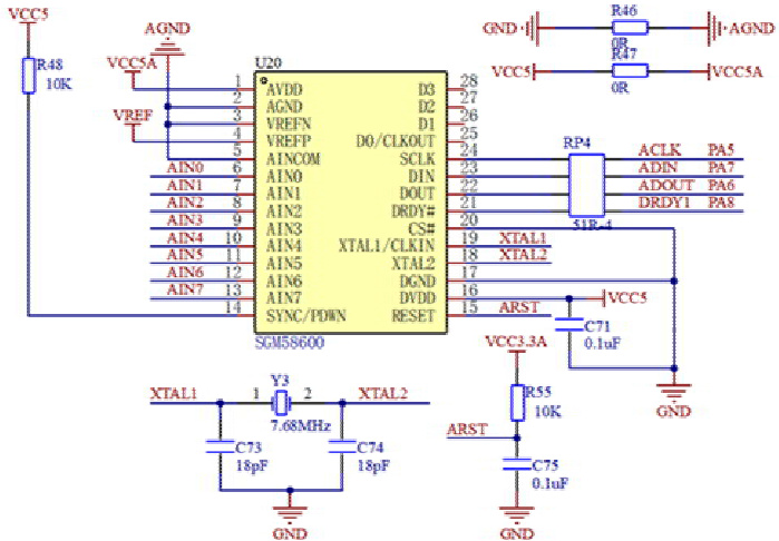 A/D 转换电路对经过流量传感器的输出信号进行采集,进而测到采样点处的实时流量并经过MCU 计算得到水流量。为了提高精准度,采用24 位模数转换芯片SGM58600,可通过SPI 接口对芯片直接进行控制。
