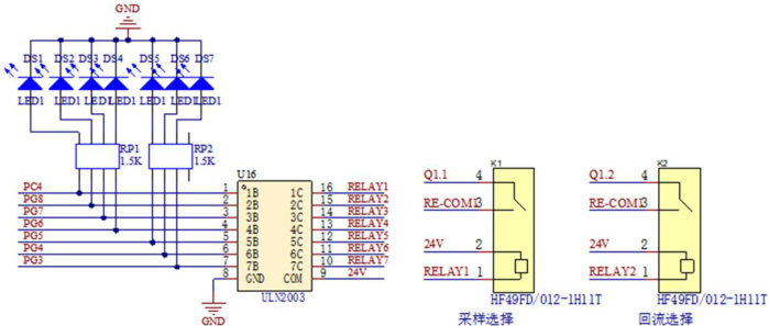 在本文所设计的水质智能采样系统控制系统装置中,有采样选择阀、A/B 采样桶水样选择阀、供样/留样选择阀、供样回流选择阀、A 桶搅拌电机控制阀、B 桶搅拌电机控制阀、A 桶排空阀、B 桶排空阀以及采样电机控制阀等控制阀门,通过各阀门的协作实现水样的各采集流程。但由于主控芯片的控制引脚的驱动能力有限,采用ULN2003 芯片与继电器相结合对各控制阀门进行控制。控制阀驱动电路如图4 所示。