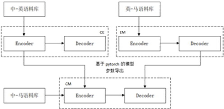 训练流程如图 3 所示,本文对中马机器翻译模型的 Encoder 和 Decoder 的参数,使用中-英机器翻译模型的中文端 Enocder 与英马机器翻译模型的马来语端 Decoder 的参数用于初始化,最后在使用中马平行语料进行训练。