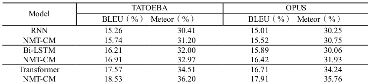 通过实验结果可看出基于迁移学习的 NMT 模型效果均优于基线模型。对于 Tatoeba 库的中马平行语料,NMT-CM 在 RNN 模型上 BLEU 值得到 0.48 个百分点提升,Meteor 值得到 0.79 个百分点提升。NMT-CM 在 OPUS 库的数据集上 BLEU 值得到 0.51 个百分点提升,Meteor 值得到 0.50 个百分点提升。NMT-CM 在 Bi-LSTM 模型上,BLEU 值得到 0.70 个百分点提升,Meteor 值得到 0.97 个百分点提升。在 OPUS 库的数据集上 NMT-CM 的 BLEU 值得到 0.53 个百分点提升,Meteor 值得到 1.87 个百分点提升。NMT-CM 在 Transformer 模型上,BLEU 值得到 0.96 个百分点提升,Meteor 值得到 1.69 个百分点提升。在 OPUS 库的数据集上 NMT-CM 的 BLEU 值得到 1.20 个百分点提升,Meteor 值得到 1.52 个百分点提升。