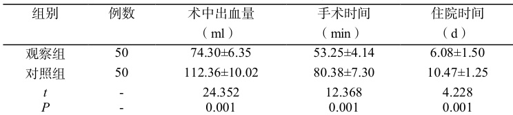 观察组患者术中出血量、手术时间、住院时间均指标低于对照组( P<0.05 ),见表 1。