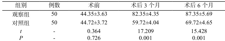 (2)采用 Lysholm 膝关节评分量表评估两组患者术前、术后 3 个月、术后 6 个月关节功能恢复情况,Lysholm 评分总分 100 分,分数越高表示关节功能越好。