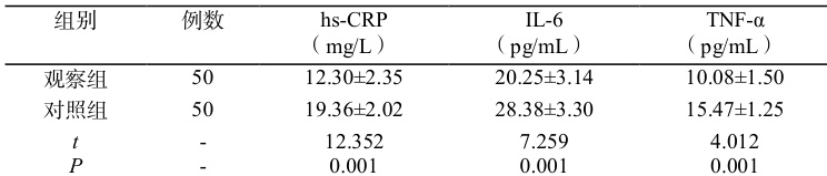 (3)炎症反应指标:分别于术前、术后 1 周采集两组患者的空腹静脉血 5ml ,采用酶联免疫吸附法检测超敏 C 反应蛋白(hs-CRP)、白细胞介素-6(IL-6)、肿瘤坏死因子- ∝ (TNF- ∝ )水平。