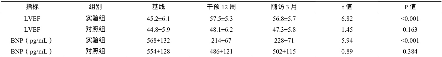 试验组治疗后 LVEF 较治疗前提高 12.3% ,在随访过程中趋于平稳(1=6.82,P<0.001, ),BNP 下降 62.3%(1=5.94J<0.001) ,均优于对照组 (P<0.01)