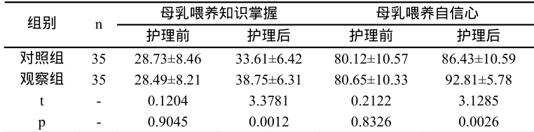 对两组产妇母乳喂养能力进行数据分析,评价指标包括母乳喂养知识掌握和母乳喂养自信心。