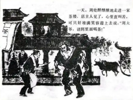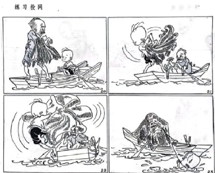 传统连环画与漫画的分镜布局基本延续了册页布局,分镜以独幅连环画与独幅漫画的形式呈现。其特点在于凝练最具代表的一瞬间,同时发挥语言符号与之互动的重要作用。漫画之父丰子恺先生的漫画作品极具个人特色,在独幅漫画的基础上将留白艺术发挥极致,画面构图以疏松和留白为主,图文分离,在此留白式构图的基调上,寥寥几笔点缀,不施以复杂的人物刻画,画面传达出的意向和气质为舒缓平静,在《护生画集》(图 1-1)中的多幅作品中深刻体现其中构图之奥妙。这种减法分镜将画面的节奏放缓,但每个画格间仍隔蕴含"不写之写"的叙事张力,同时也能依靠题跋补充叙事。戴敦邦先生的连环画在分镜上的呈现则是独幅的基础上固定尺寸,在其早期作品连环画《除三害》(图1-2)中采用的分镜构图是图文结合的形式,一图辅以一文,文嵌图中,另一种则是图文分离,以方形框最为画面的分割线,其作品《一支驳壳枪》则采用这种分镜形式。