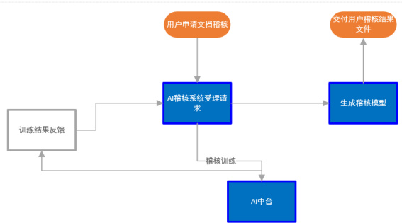 用户在AI 稽核用户操作界面上传标书文档,申请文档稽核,系统受理稽核请求后,调用AI 中台模型能力,进行稽核训练并返回稽核模型结果,输出标书稽核报告反馈给用户。