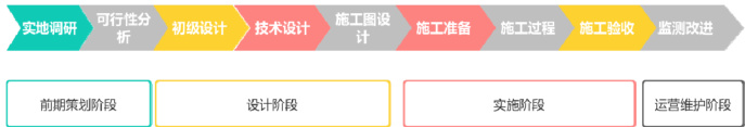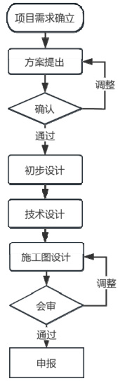 此部分的设计实施阶段主要包括设计和实施两个阶段,其中设计阶段涉及到的关键环节为工程项目需求确立、方案提出与确认、初步设计、技术设计、施工图设计等,具体流程如下图 2 所示。在设计阶段,需要结合修缮工程建设目标,并和同类型建筑项目对比、分析,明确项目需求,基于此初步提出设计方案并进行讨论;根据通过后的方案开展初步设计,此过程包括项目类型确定、建设功能、内部布局等,是对工程项目开展的整体设计,实现工程建筑统筹规划;完成初步设计后,开展工程项目技术方案设计,此部分的内容主要集中在对具体关键技术、技术难题以及施工工艺的确定,此过程是对初步设计的细化;最后进行施工图设计,施工图是施工活动开展的指导文件,内容具体包括工程项目设计说明、图例、平面图和系统图等,开展施工图设计需要以已经批准通过的工程项目初步设计以及技术设计等为基础,并且完成设计后,做好对其内容的校对、审查和签字。