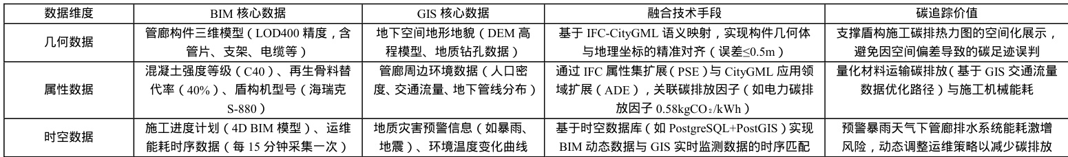 盾构施工(如土压平衡盾构机)的碳排放与地质条件(如土层渗透率、含水率)强相关,传统静态模型误差率高达 35% ;再生骨料混凝土(替代率 30%~50% )的碳减排效益因再生骨料来源(建筑垃圾种类、预处理工艺)差异显著,传统方法无法区分其与天然骨料碳排放的级配效应;施工机械(如履带吊、混凝土泵车)的碳排放随负载率波动,但传统核算以额定功率计算,导致单日碳排放偏差可达 ±22% 。BIM 模型聚焦构件级属性(如混凝土强度等级C40、钢筋直径 25mm ),但缺乏地理空间坐标(如 WGS84 坐标系下的经纬度),难以与 GIS中的地质雷达探测数据、地下管线普查数据融合;GIS 可展示管廊的空间分布(如管廊中心线与地铁线路的平面交叉),但无法解析施工阶段盾构机实时掘进参数(如推进速度、扭矩)与碳排放的动态耦合关系。基于BIM 构件级数据与GIS 空间分析,建立盾构施工碳排放动态预测模型,通过 IFC-CityGML 数据互操作,实现管廊构件碳排放与地质条件、交通流量的时空关联分析,集成物联网传感器与数字孪生技术,对运维能耗进行分钟级监测与优化,降低碳排放。