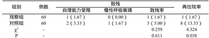 2.1 致残与再住院率相比对照组,观察组再住院率更低( ΦP<0.05 )。见表 1。表 1 两组患者致残与再住院率对比 (n,%)