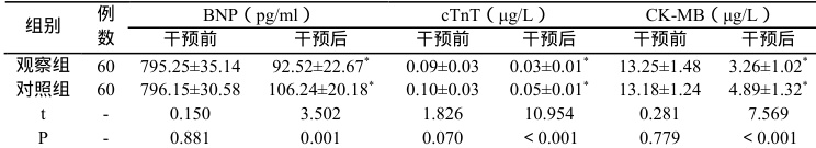 干预前,干预后,采集静脉血, 3000r/min 离心10min,分离血清,用酶联免疫分析法测定脑钠肽(Brain natriuretic peptide,BNP)、肌钙蛋白 T(cardiac troponinT,cTnT)、肌酸激酶同工酶(CreatineKinase isoenzyme,CK-MB)。