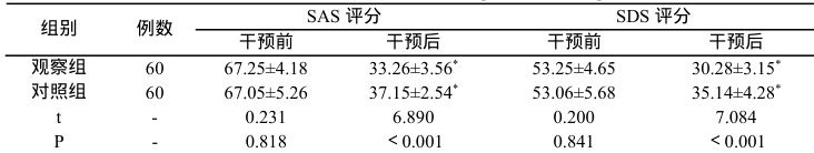 干预前,干预后,用焦虑自评表(Self-RatingAnxietyScale,SAS)、抑郁自评表(Self-rating DepressionScale,SDS)评价,临界值分别 50 分、53 分,超过此范围代表存在相应负性情绪,且分值越高越严重。