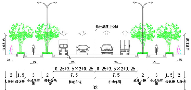 现有某新建道路工程,工程路线全长约 839m⨀ 。道路等级为城市次干路,道路规划红线宽 32m,设计速度40km/h。道路中心线位基本按规划布设,路线全长约0.84km,呈南北走向。工程起点处有1 处平曲线,圆曲线半径为1500m,全线不设缓和曲线、不设超高。该道路标准断面布置如下如图1 所示。